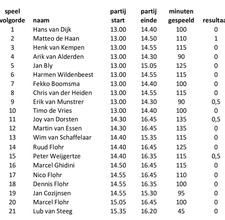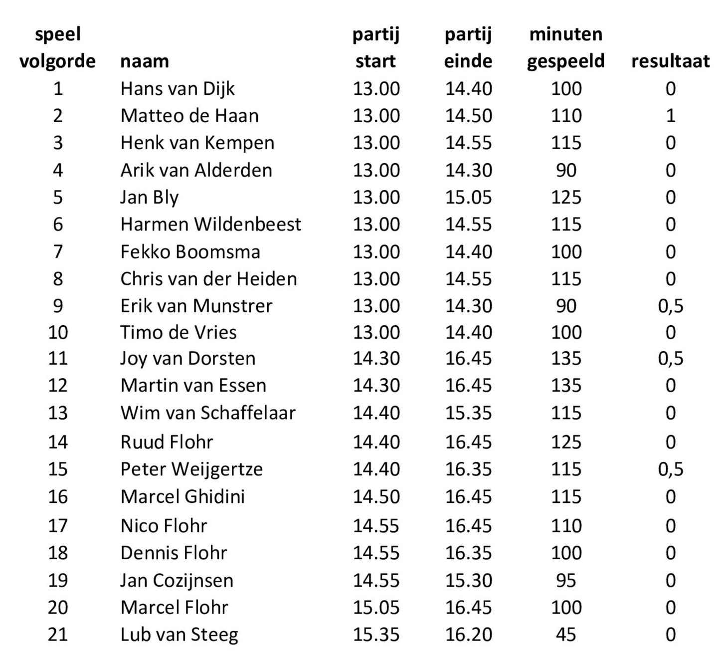 Ik besluit met wat kentallen. Er zijn 21 partijen gespeeld. De kortste duurde 45 minuten, de langste 2 uur en een kwartier. De leeftijd van de deelnemers varieerde van 17 tot 86 jaar. Er deden 4 huisschakers mee en spelers van 4 verenigingen (Leusden, Utrecht, Hoevelaken en Nijkerk). Helaas deed er slechts een dame mee. De gemiddelde partij duurde 107 minuten.